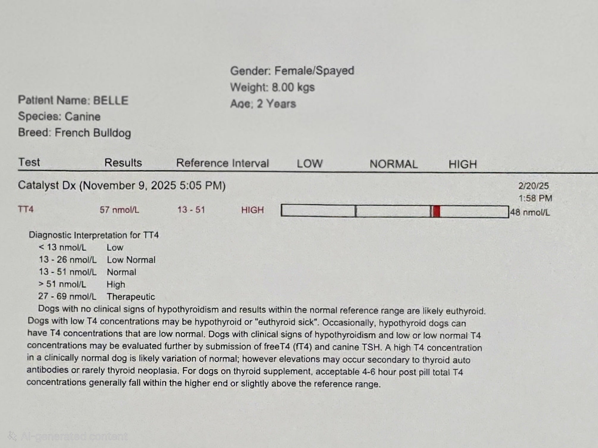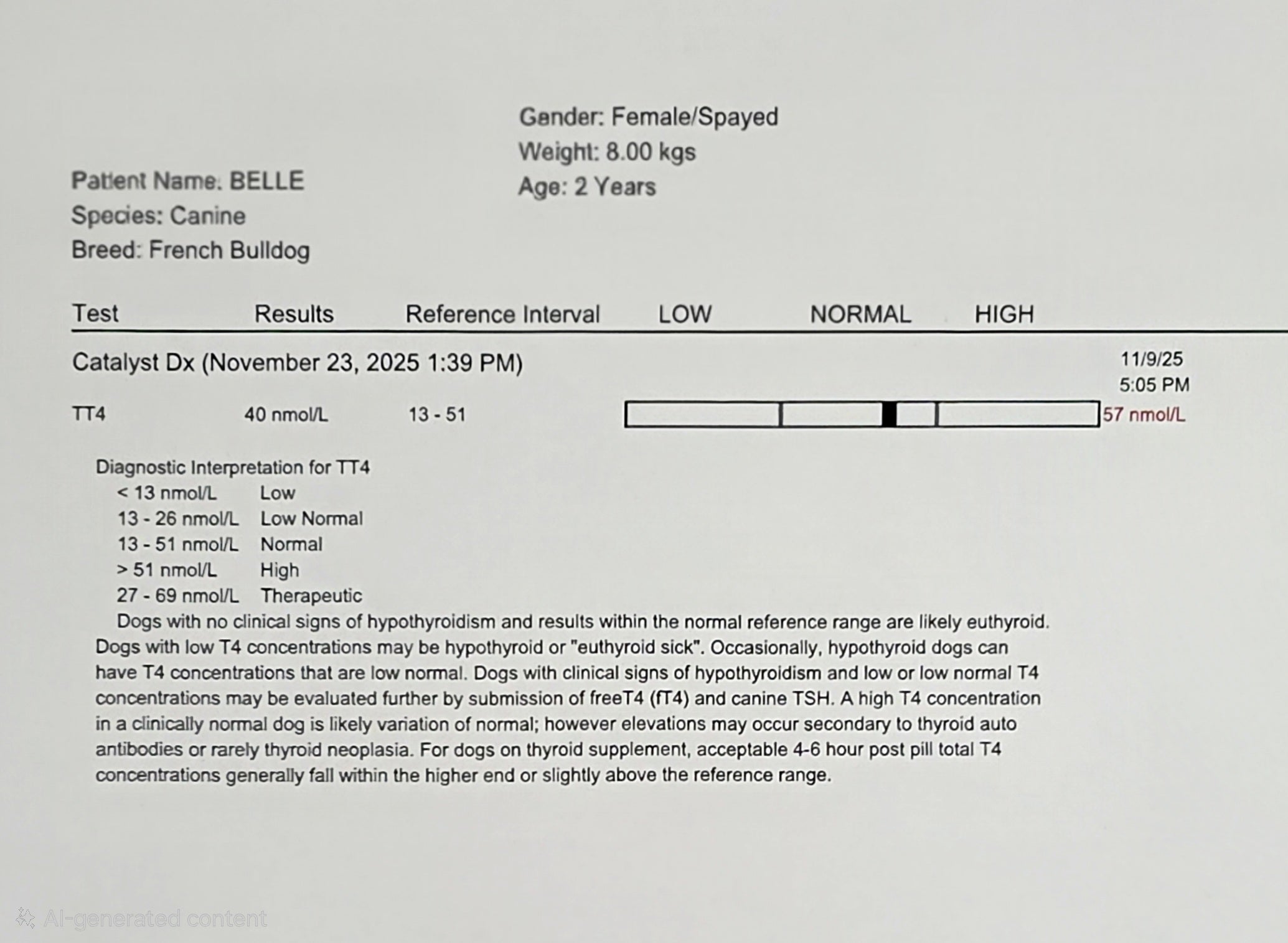 Gazdijai is előszeretettel alkalmazzák a természetes gyógyászat adta lehetőségeket, így ők el se kezdték nála a gyógyszeres terápiát. Ezen a képen jól látható, hogy a pajzsmirigy hormonszint 57nmol/L-el már a magas kategóriába esik.